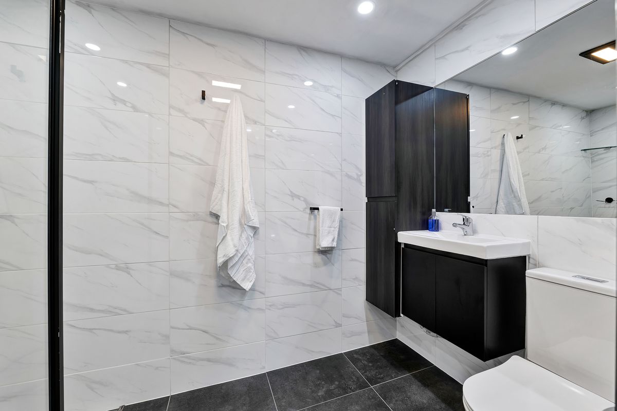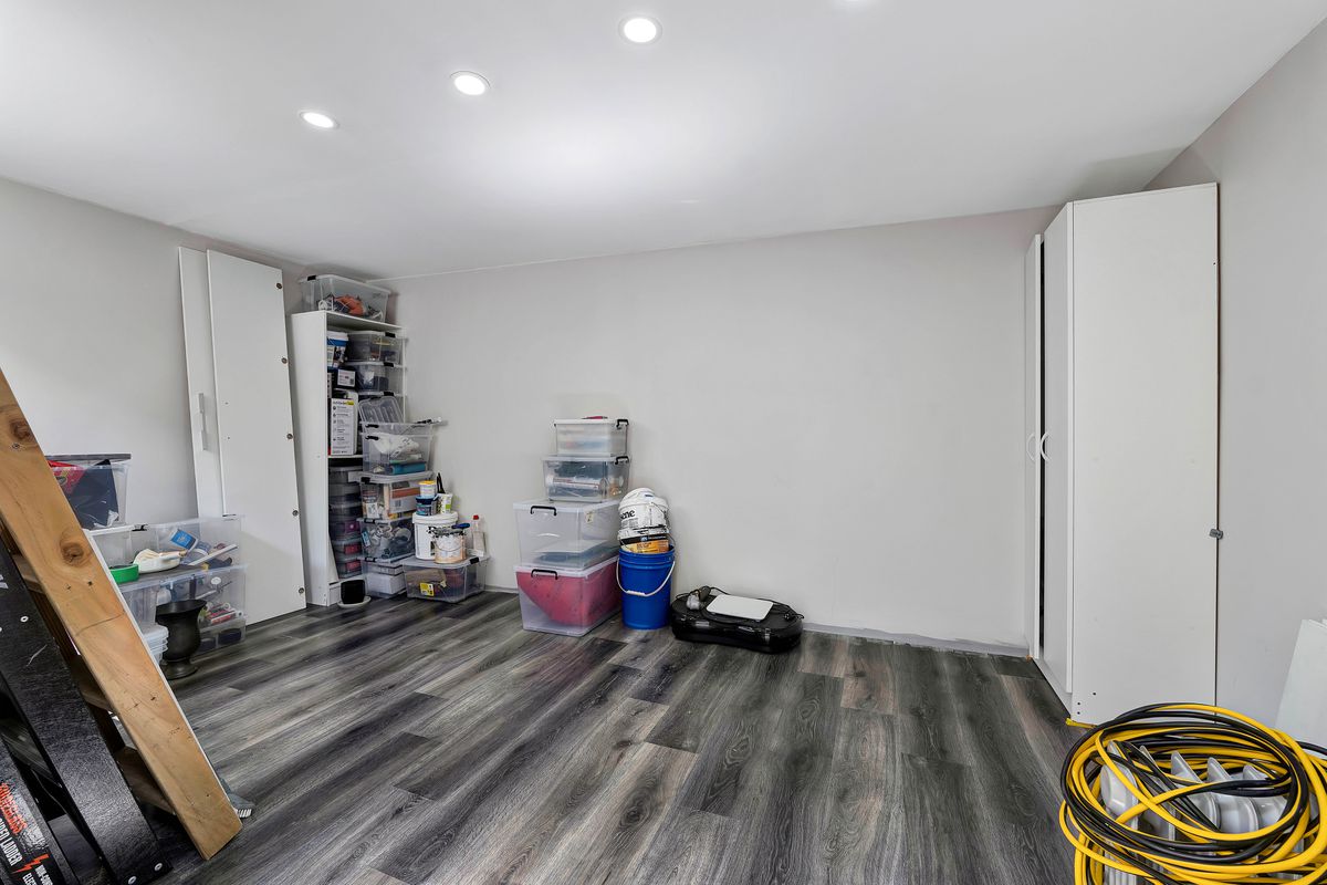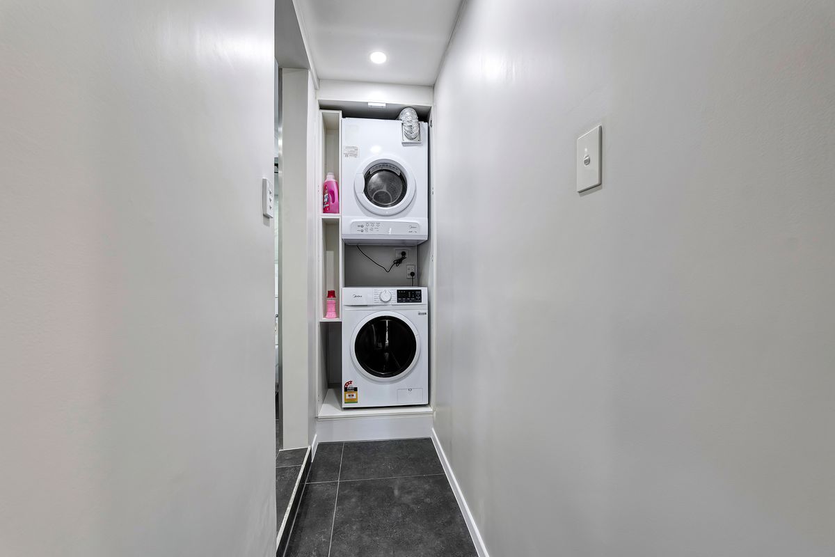 The fully tiled bathroom brings a touch of quality with a spacious walk-in shower and large mirrors, and the laundry sits neatly alongside with space for a stacked washer and dryer. The converted garage adds flexibility as a hobby or rumpus room without adding extra upkeep.