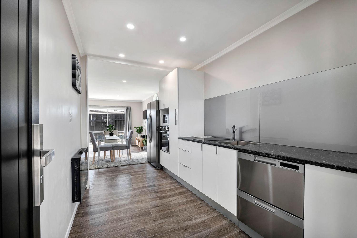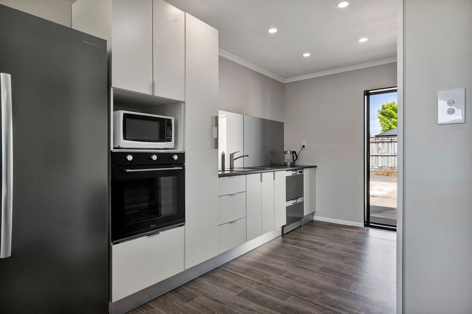 The open-plan kitchen and living area is light and welcoming, featuring a unique arched frosted window that adds character while maintaining privacy. The modern kitchen offers good storage, a wall-mounted oven, and an induction cooktop, while the neutral palette throughout provides a clean, timeless feel.