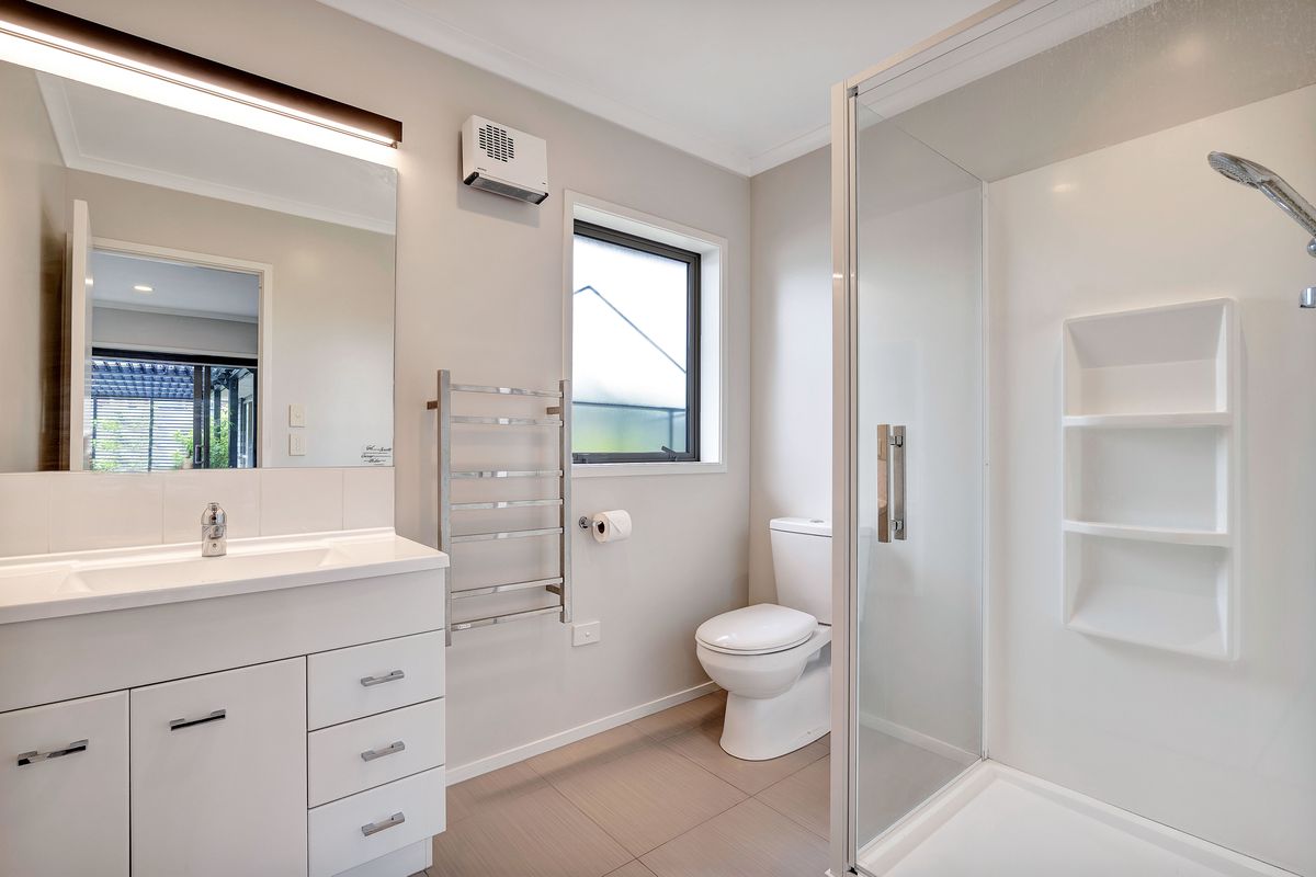 The open plan kitchen anchors daily routines with gas cooking, a centre island and plenty of storage. Its flow through the dining area and into the lounge creates a natural gathering point for meals, homework sessions and relaxed evenings. Soft neutral tones throughout keep the interior calm and welcoming, and large windows draw in natural light. The main bathroom has both a separate bath and shower, and each bedroom includes its own wardrobe. The central heating and cooling system keeps the temperature steady year-round. The master suite provides its own escape with an ensuite and direct access outside.