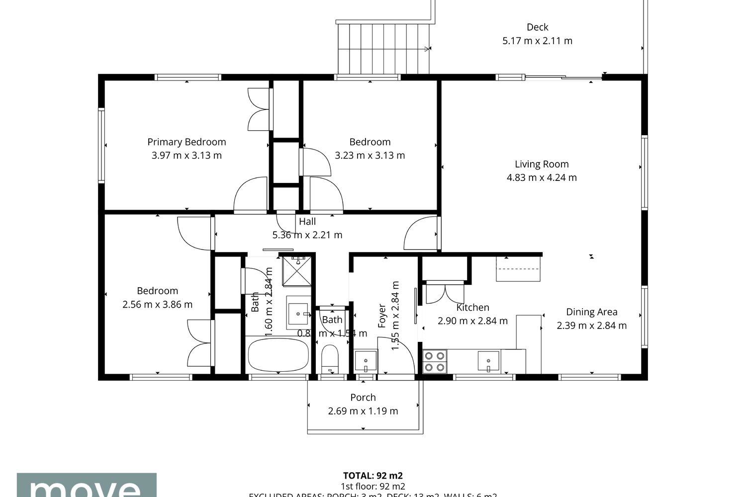 Inside, the layout is practical and welcoming. Open plan living, dining and kitchen areas create a natural hub, filled with sunlight from generous windows. The living area opens directly to the deck, allowing fresh air and an easy indoor–outdoor flow that suits busy days and relaxed evenings alike. Three bedrooms are well proportioned, each with built-in wardrobes, while the bathroom offers both a separate bath and shower. A separate toilet adds everyday ease, and the heat pump keeps the home comfortable through the seasons. At 95sqm, the space is well considered and flows smoothly from room to room.